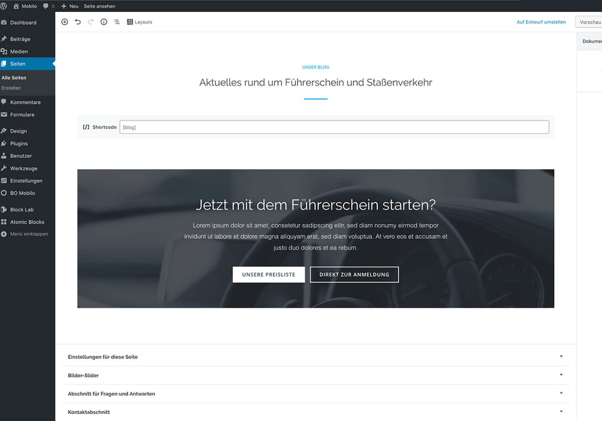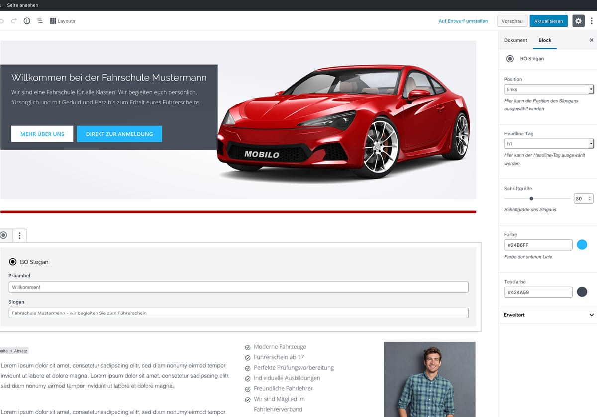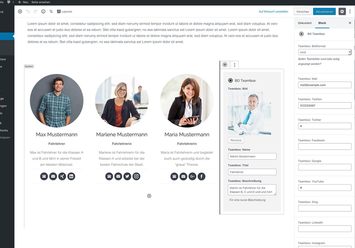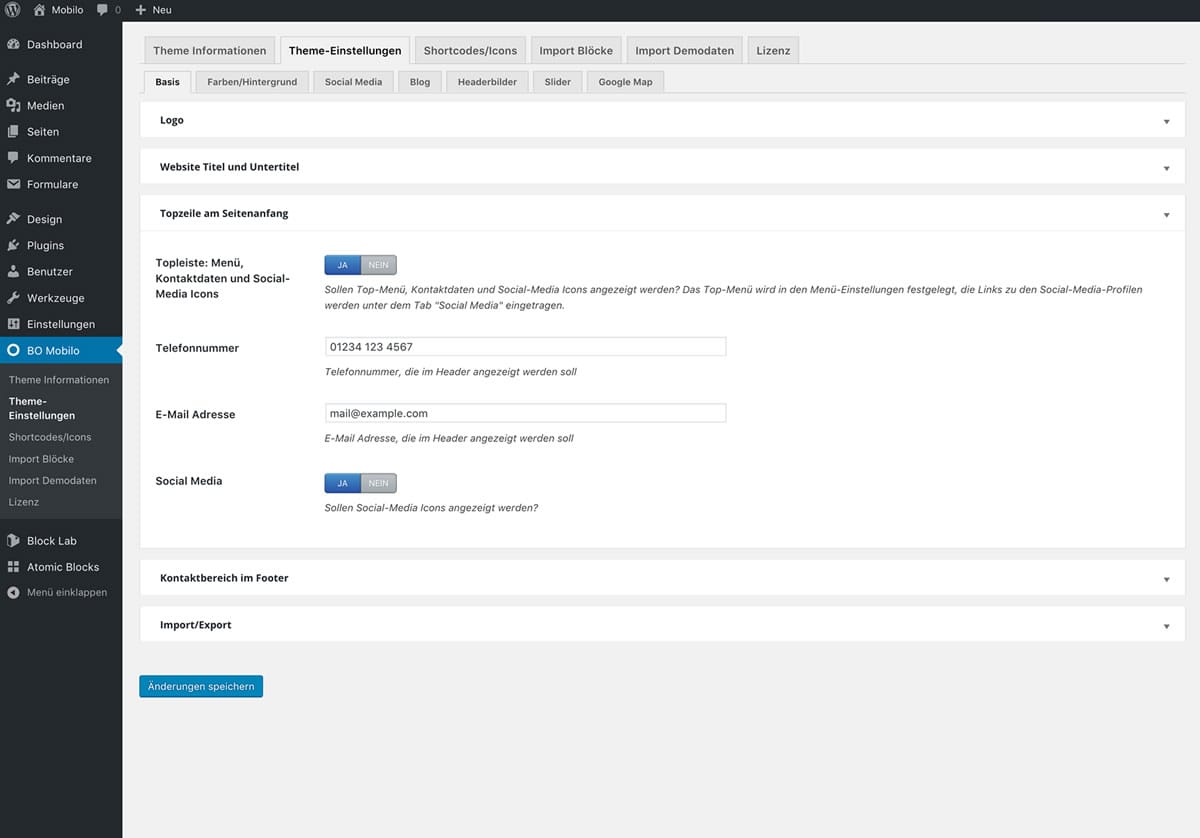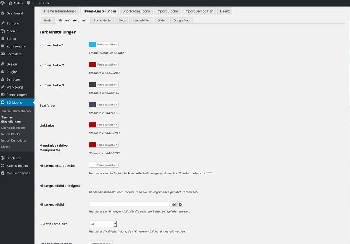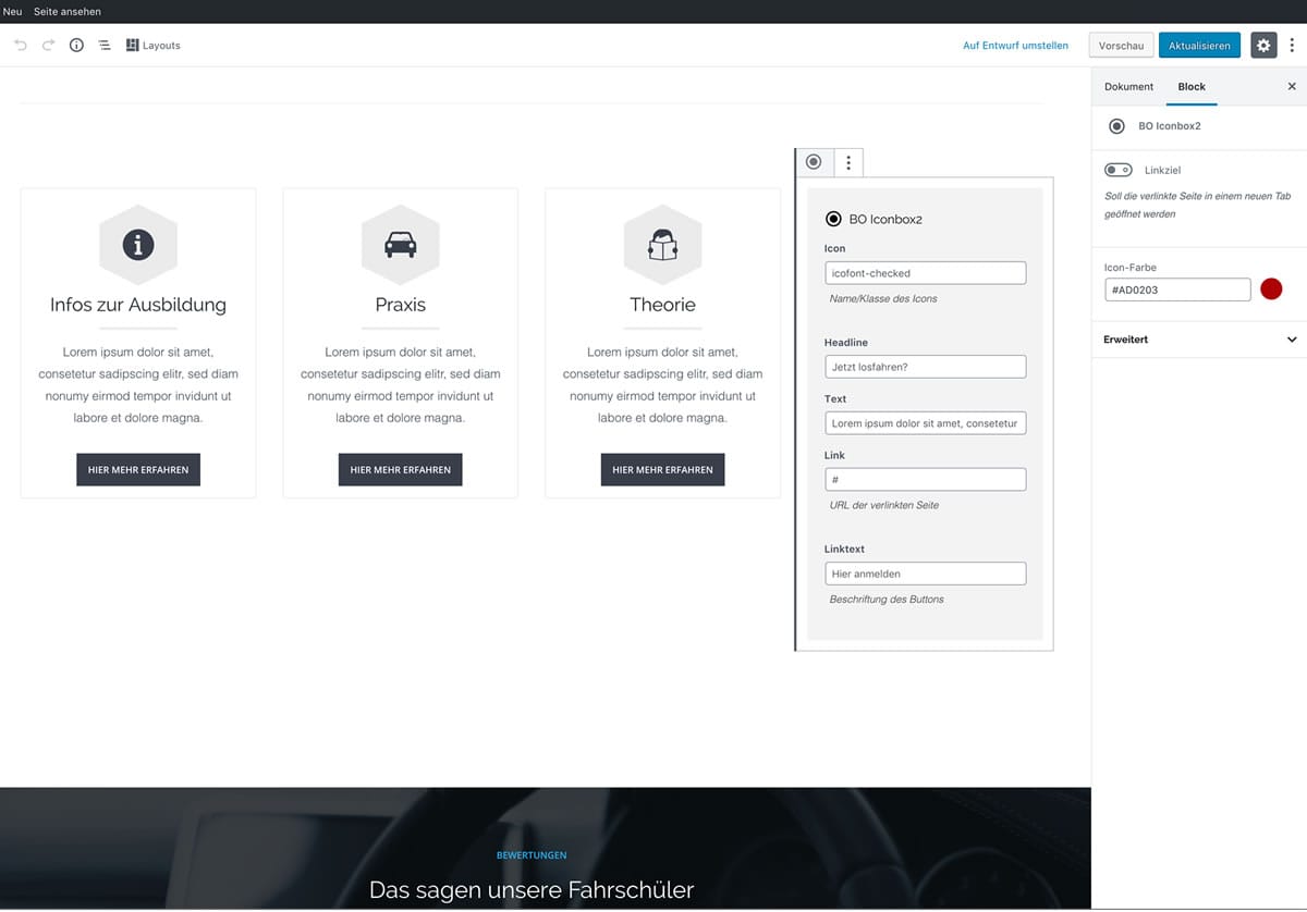 Hier finden Sie einige Screenshots zu den verschiedenen Elementen im WordPress Dashboard. Zum Vergrößern auf ein Bild klicken! Theme-Einstellungen Optionaler Kontaktabschnitt im Footer Individuelle Farbauswahl Beispiel: Iconbox-Block Individuelle Seiteneinstellungen Beispiel: Teambox-Block Blockbearbeitung im Editor Beispiel: CTA-Block